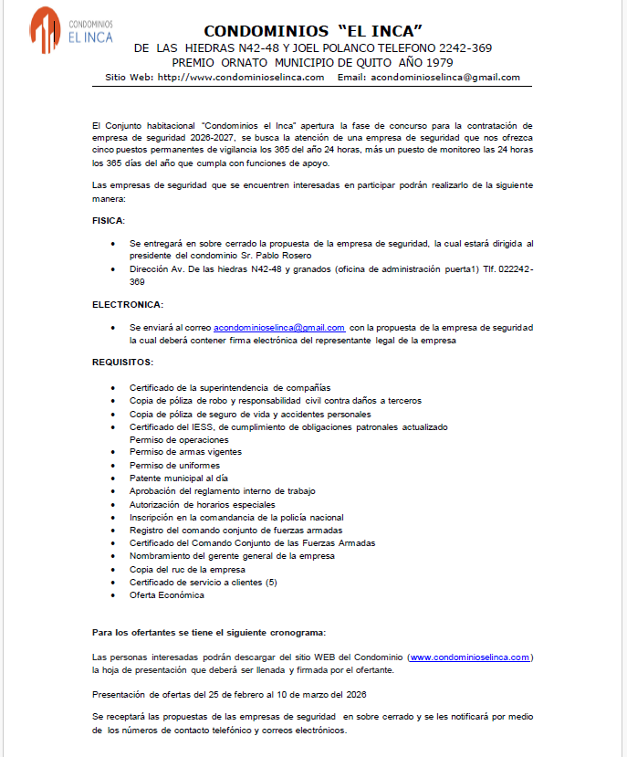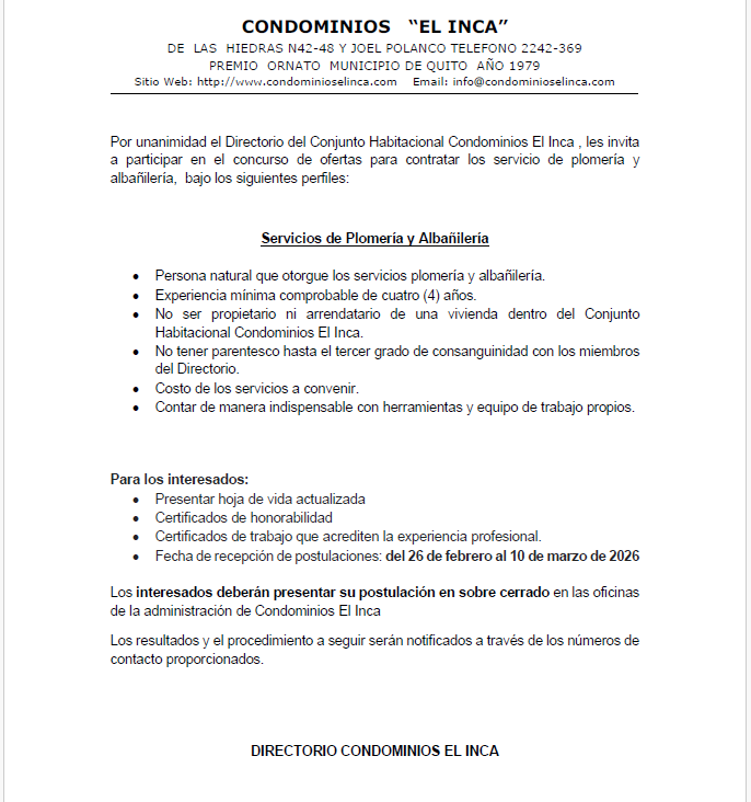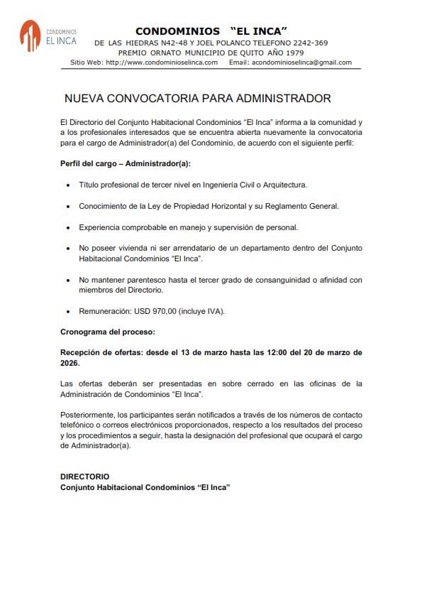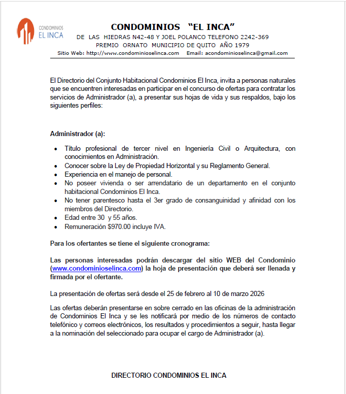 El Conjunto Habitacional Condominios “El Inca” tiene el grado de invitar a la comunidad a participar en el concurso de ofertas que se encuentra actualmente en curso.
